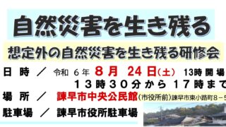 一般向け想定外の自然災害を生き残る研修会(R6諫早) 【想定外の自然災害を生き残る研修会】終了しました日時令和6年8月24日(土)13時30分~17時場所諫早市中央公民館自然災害を生き残るための研修会では想定外の災害に備えるための機材や知恵が紹介されます暖房用品の利活用方法や防災術など参加者に... 2024.08.24一般向け
